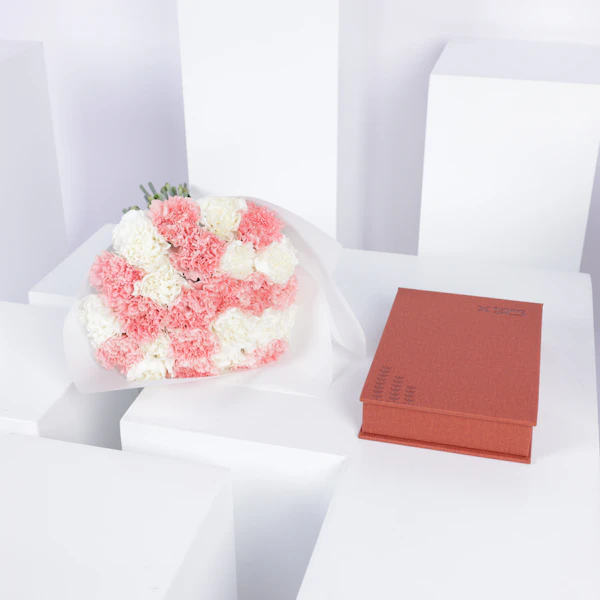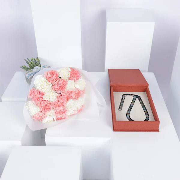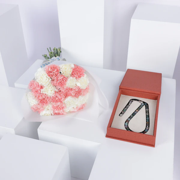 احتفل بمتعة العطاء مع هذه الهدية الرائعة - مسبحة خضراء داكنة في صندوق برتقالي أنيق مع بباقة رقيقة من زهور الكارنيشن البيضاء والوردية، مقدمة بأناقة في غلاف أبيض نقي. سواء كانت لمناسبة يوم الأم، أو رمضان، أو موسم الحج والعمرة، تجسد هذه الهدية جوهر الحب والتفاني. تخيل السعادة في عيون من تحب عندما يتلقون هذه البادرة اللطيفة، ويتمتعون بجمال المسبحة الخضراء وجمال زهور الكارنيشن الزاهية. اجعل كل مناسبة لا تُنسى مع هذه الرمز المعبّر عن المحبة والاهتمام.