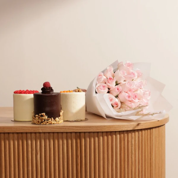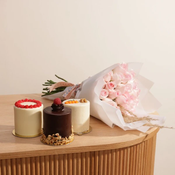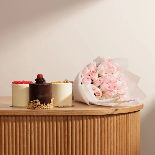 استمتع بتجربة لا تُنسى مع كيك ثلاثي من روز ريبون. كل كيك مصنوع بعناية فائقة ومليء بنكهات شهية تأسر الحواس، بما في ذلك الشوكولاتة الغنية، والريد فيلفيت الناعم، وطعم اليقطين الفاخر. يأتي كل كيك مقدمًا في تقديم فردي مميز، مقترن مع باقة من الجوري الوردي الفاتح، لتضفي لمسة من الرومانسية والجمال. ومع وجود 25 جوري رائعة تأتي مع غلاف أبيض أنيق، ستكون هذه التجربة لحظة لا تُنسى لك ولأحبائك. كيك ثلاثي من روز ريبون هو خيار مثالي لجميع المناسبات، سواء كانت احتفالات الأعياد أو اللحظات الخاصة، فهو يجمع بين لذة الطعم وجمال العرض بطريقة لا تُقاوَم.