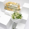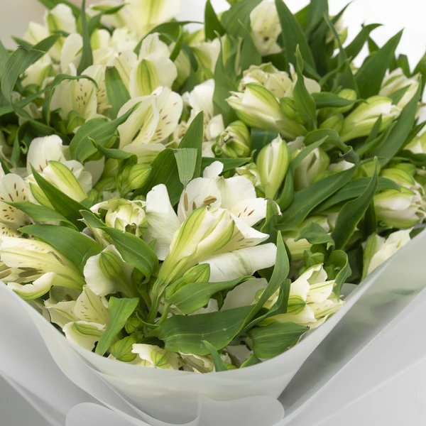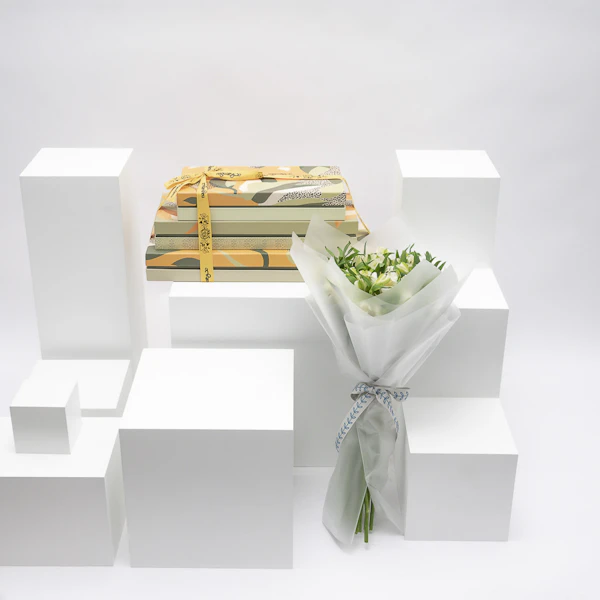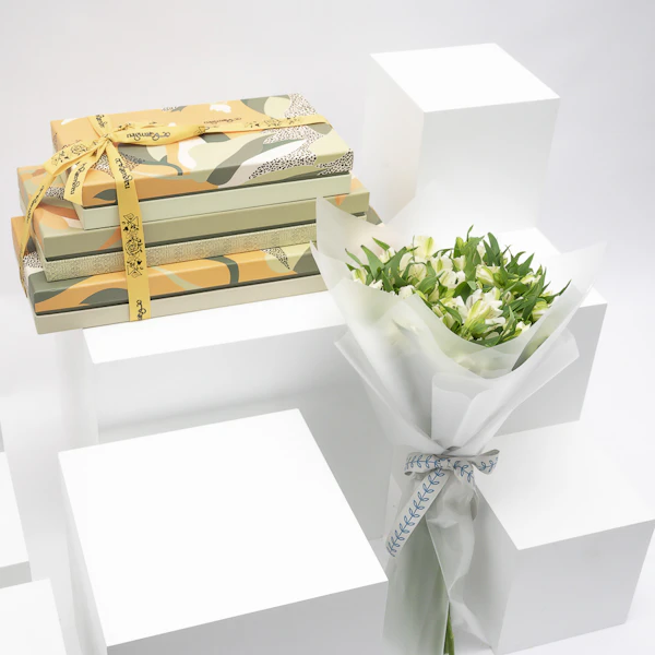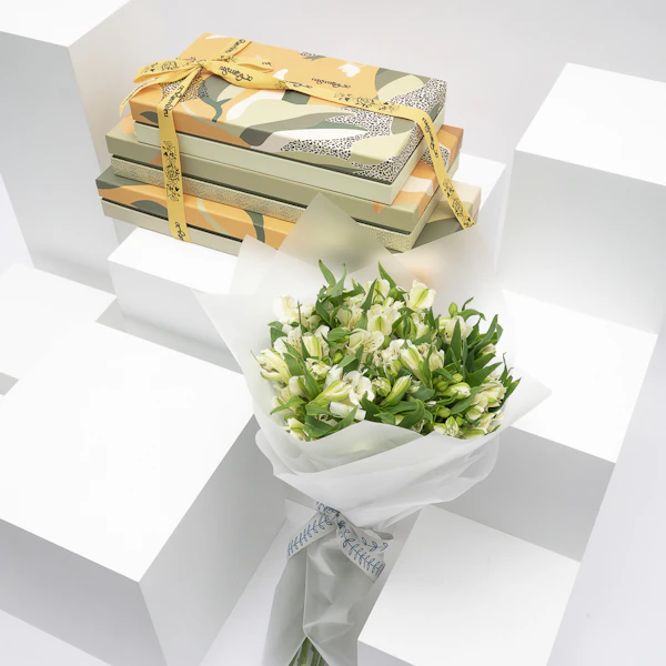 هدية لذيذة ومبهجة تتكون من ثلاثة علب مليئة بمجموعة متنوعة من الحلويات المشكلة من نقوة وباقة بيضاء من زهور الألستروميريا الرقيقة، تغمر مساحتك بالسحر والعذوبة. جرب هذا المزيج المثالي من النكهات والزهور مع هذه الهدية المميزة واللذيذة.