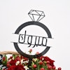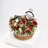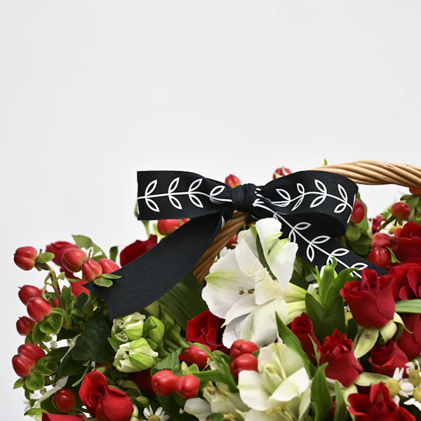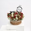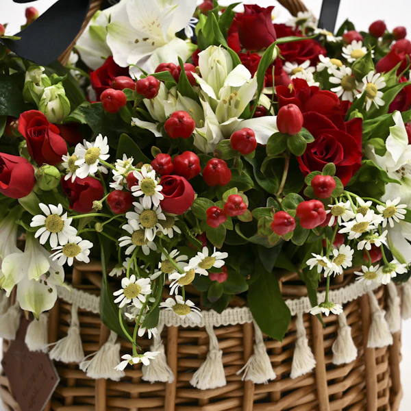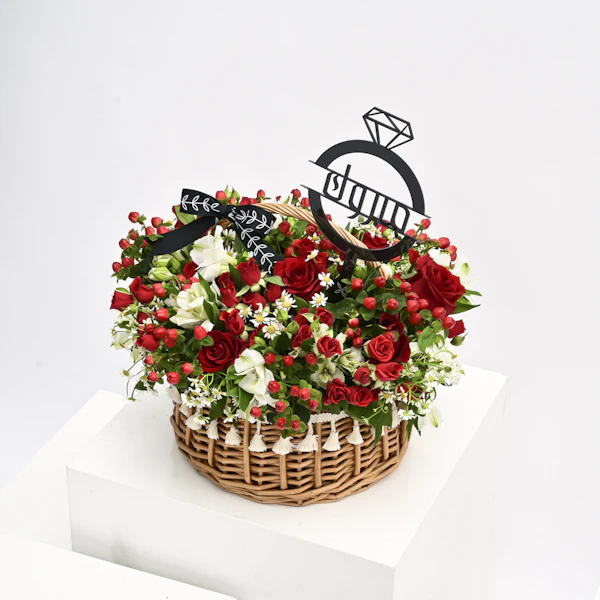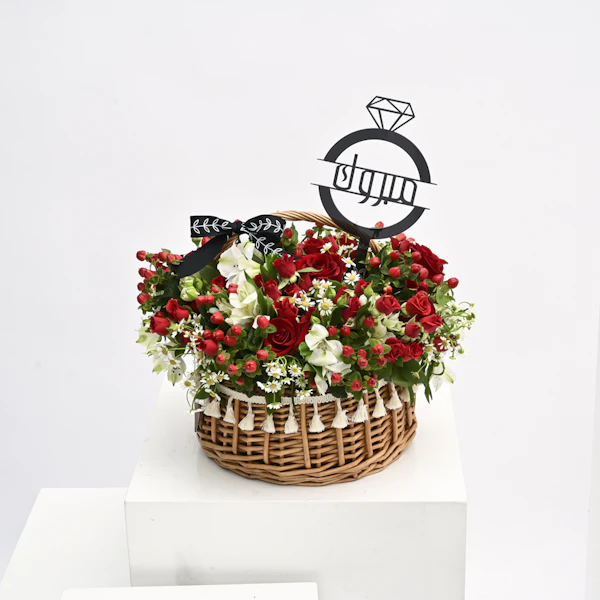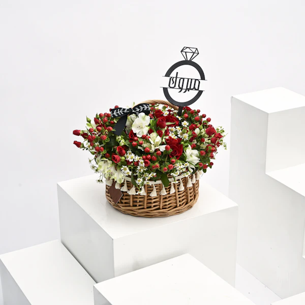 سلة أزهار مُنسقة بورد الجوري الأحمر، ورد الجوري الأحمر الصغير، أزهار الهايبركم الحمراء، أزهار الاستروماريا البيضاء، أزهار البابونج بالإضافة الى تغريسة مبروك والمصممة مع خاتم خطوبة.