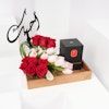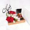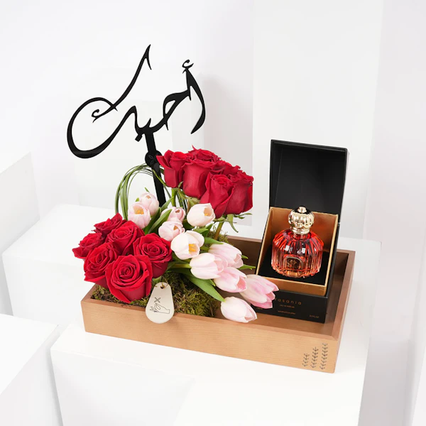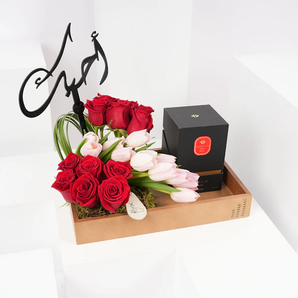تأتي هذه الهدية مصحوبة بتنسيق ساحر من الجورى الحمراء وزهور التيوليب الوردي، التي تعبّر عن الحب والعاطفة. ولإضافة لمسة مميزة، قد وضعنا عود تزيين "أحبك" لتعبر عن حبك وعشقك تجاههم.