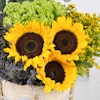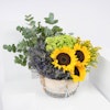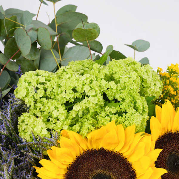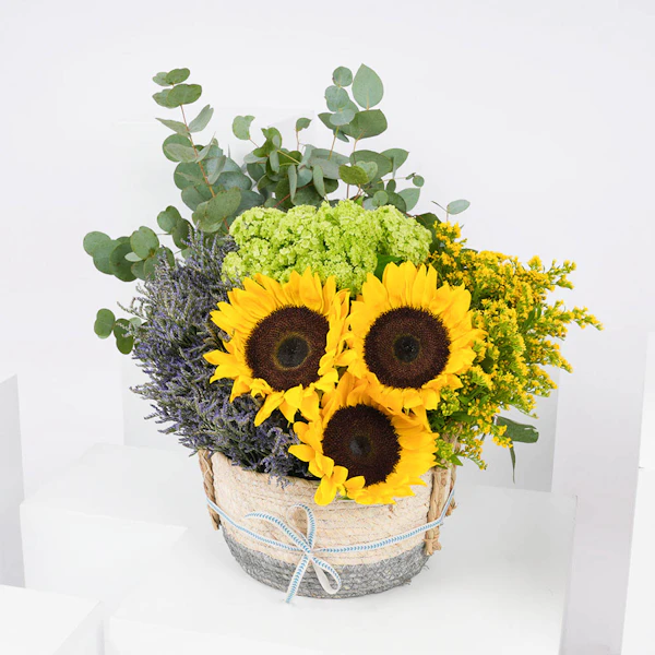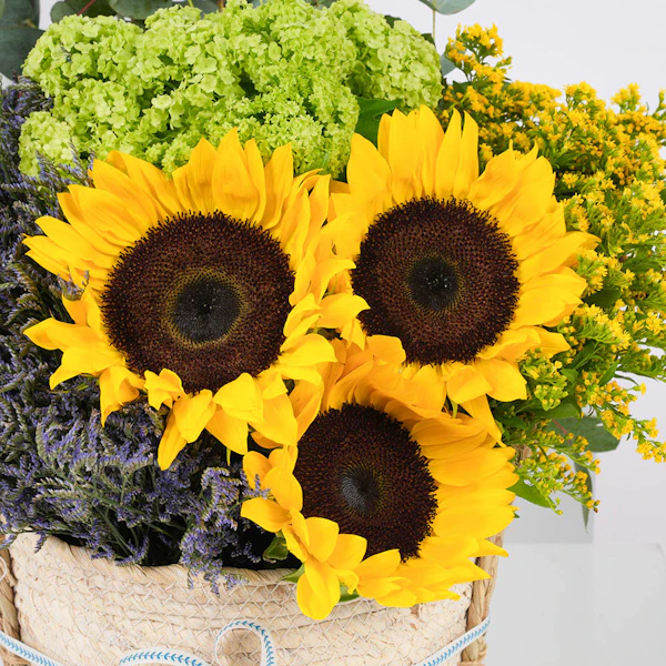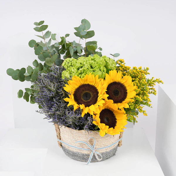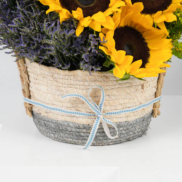يلتقي دوار الشمس الأصفر المبهج بالسحر المريح للخزامى البحري الأزرق ،في سلة من الصفصاف ، مما يخلق احتفالًا آسرًا بجمال الطبيعة وفرحها. هدية خالدة تتناقض مع الأناقة والهدوء.