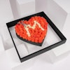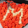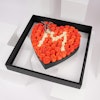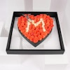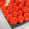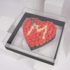 - صندوق أسود مع غطاء من الاكريلك الشفاف مُنسق بالأزهار على شكل قلب مع حرف من اختياركم الشخصي، يحتوي هذا الصندوق على ورد الجوري البرتقالي مع ورد الجوري الأبيض الصغير.