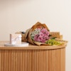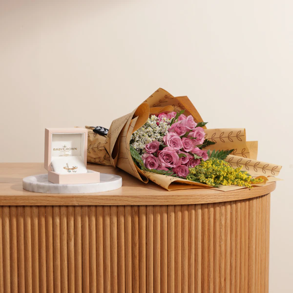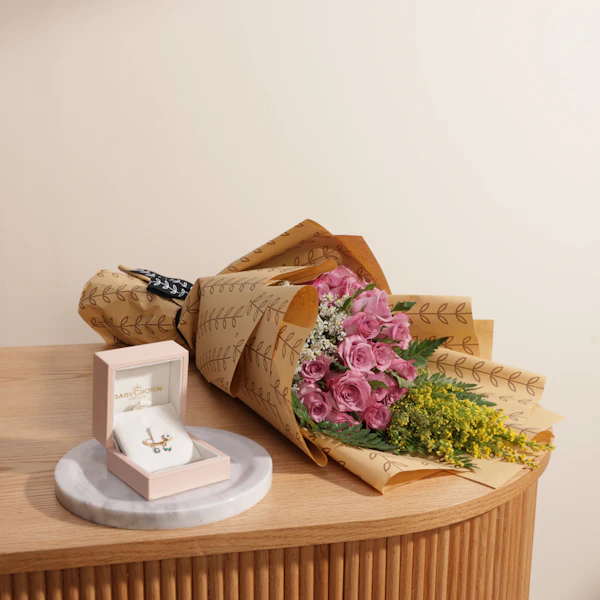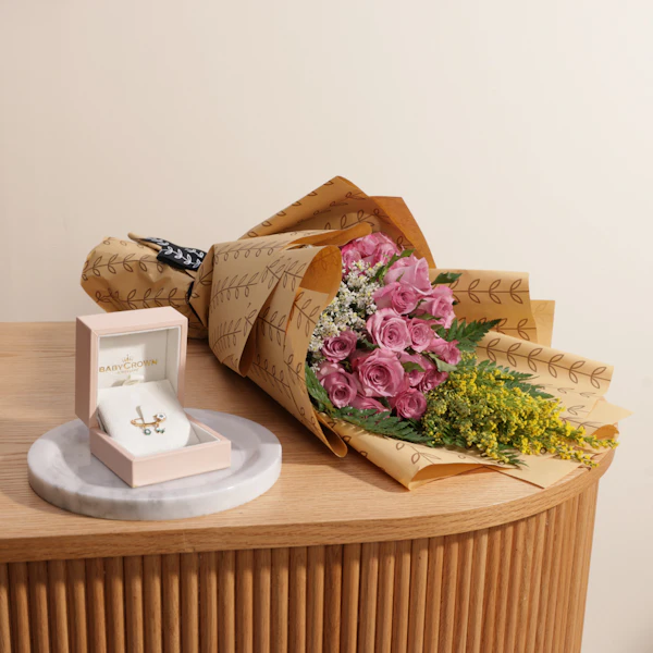 احتفل بقدوم المولود الجديد بأناقة ورقي مع هدية مميزة تجمع بين المفيد والجميل. اخترنا لك مشبكًا للأطفال من بيبي كراون، مصنوعًا من ذهب عيار 18 قيراطًا ليكون رمزًا للرفاهية والأمان. ولإضفاء لمسة من الجمال، أضفنا باقة زهور متناسقة تتألف من جوري بنفسجي وليمونيوم أبيض، مع عصا ذهبية اللون لتكتمل الروعة. ولتكون الهدية أكثر جاذبية، قمنا بتغليفها بعناية في غلاف فلاورد البني، الذي يضيف لمسة أنيقة وجذابة. اجعل لحظات الاحتفال بهذه الهدية تبقى خالدة ومميزة في ذاكرة الأحباء.