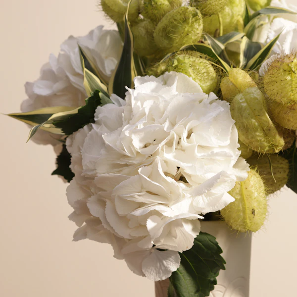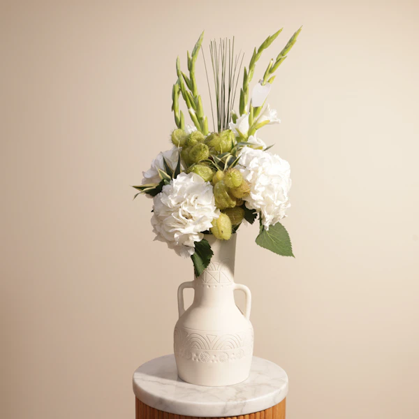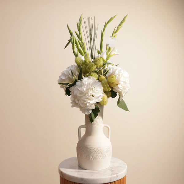 اكتشف سحر الأناقة مع باقة الزهور الرائعة التي تشمل هيدرانجيا بيضاء وغلاديولس أبيض، كل منها ينضح بالنقاء والجمال. مصممة بعناية لتتألق في مزهرية كيراموس ستوديو الأنيقة، تضيف لمسة من الرقي إلى أي مساحة. هذه الباقة المثالية ستجعل كل لحظة خاصة ومميزة. إذا كنت تبحث عن طريقة رائعة لإضافة لمسة من الفخامة والصفاء إلى ديكورك، فهذه هي الاختيار الأمثل. اطلب الآن واستمتع بجمال الخريف مع هذا العرض المميز. اجعل كل مناسبة لا تُنسى مع لمسة من الأناقة الرائعة.
