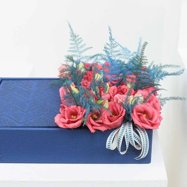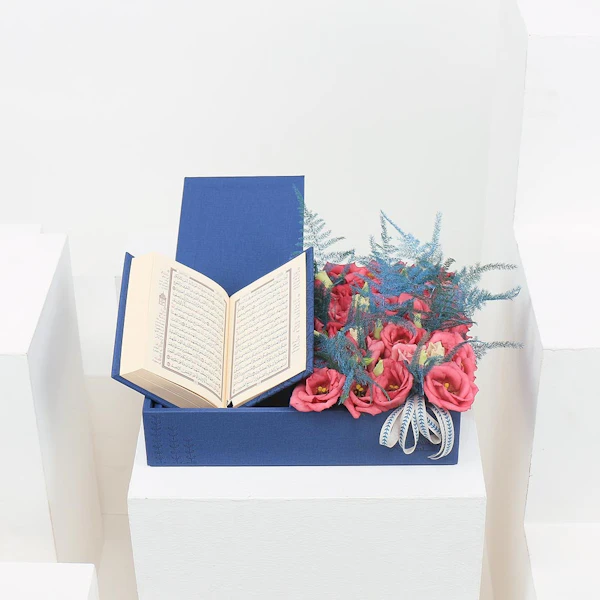 تنسيق من زهور الايستوما ذات اللون الزهري مع مصحف