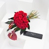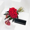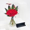- باقة أزهار تحتوي على 23 وردة من الجوري الأحمر مع 2 من أزهار الانثوريوم باللون العنابي.