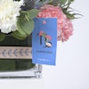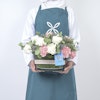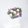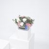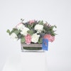 تنسيق مزهرية ابيض و زهري اللون من زهور القرنفل و ارنجيوم ازرق اللون مع بطاقة لبرج الجدي