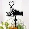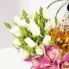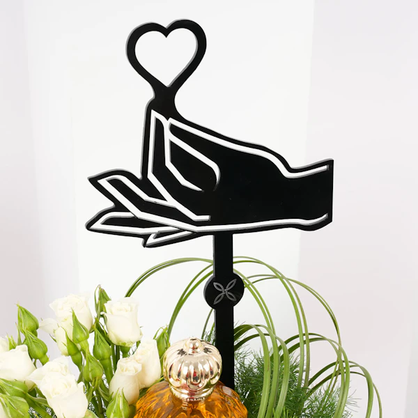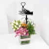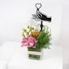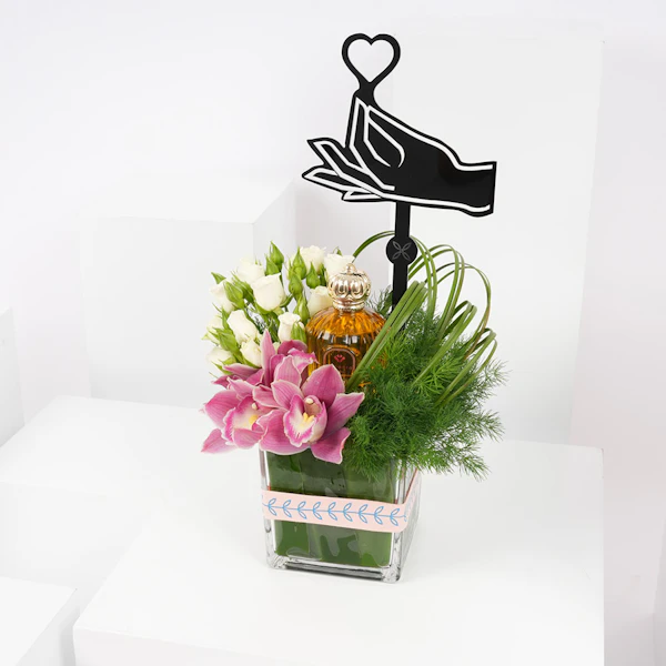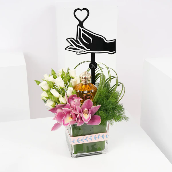 • مزهرية زجاجية مربعة الشكل مُنسقة بورد الجوري الأبيض الصغير، أزهار السمبيديم الوردية، نبات السرخس مع الستيل قراس بالإضافة الى تغريسة يد مع قلب.