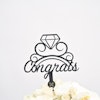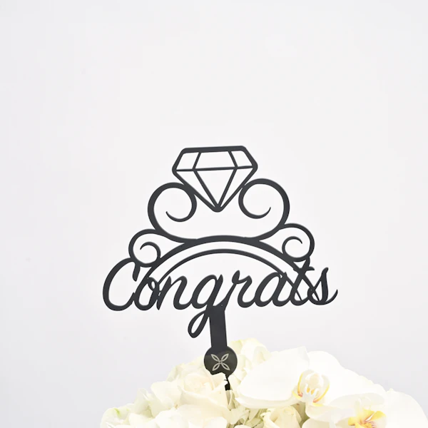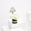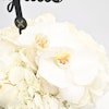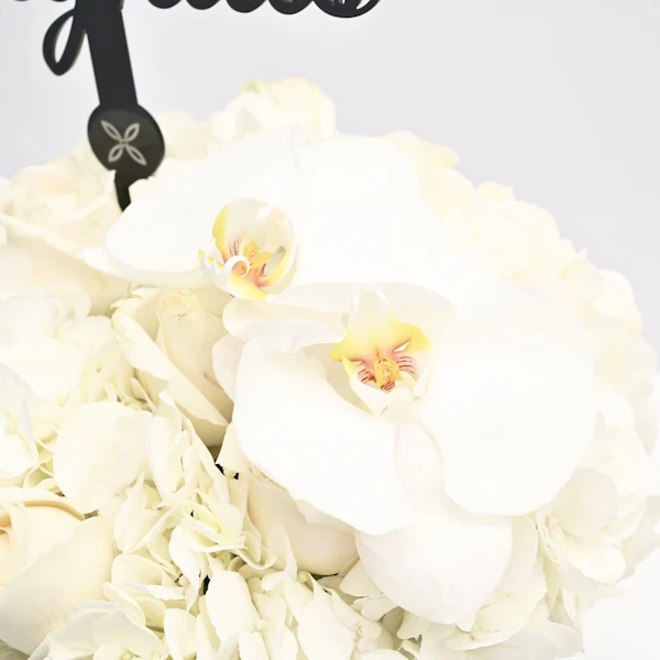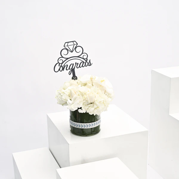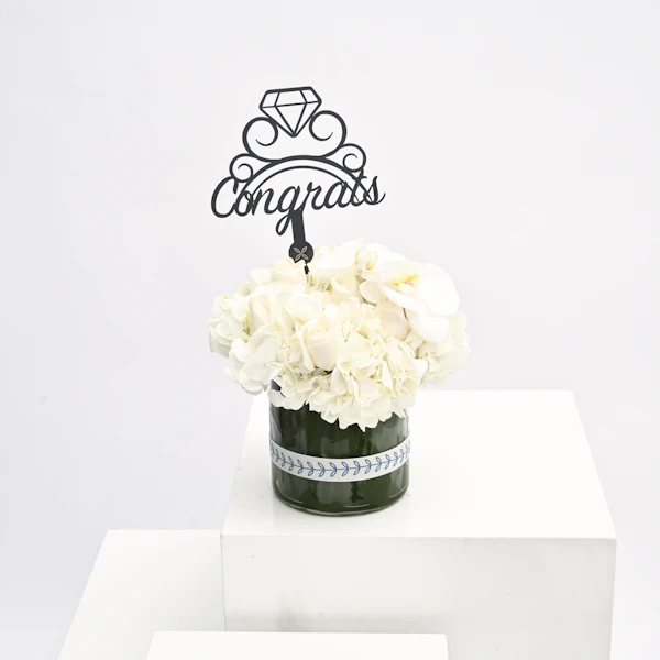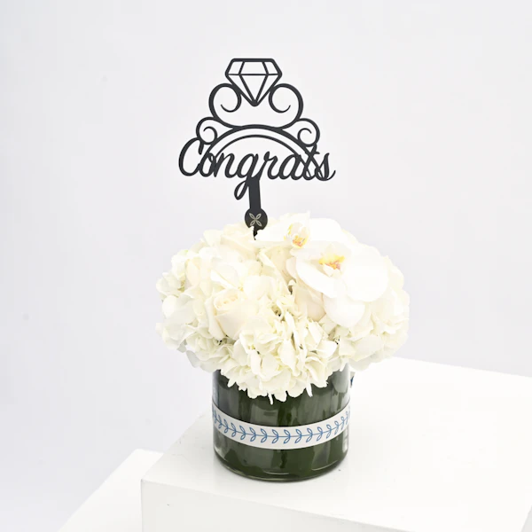 فازة أزهار زجاجية اسطوانية الشكل مُنسقة بورد الجوري الأبيض، زهر الاوركيد الأبيض، زهر الهيدرينجا الأبيض مع تغريسة مبروك باللغة الإنجليزية والمصممة مع خاتم خطوبة.