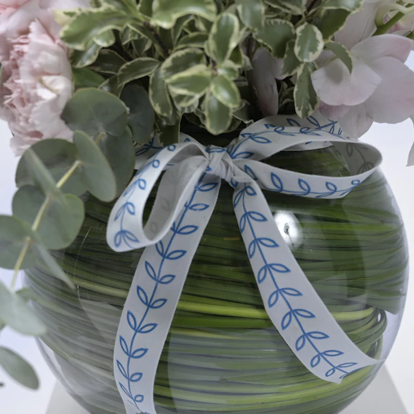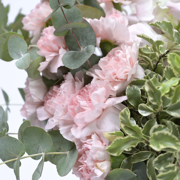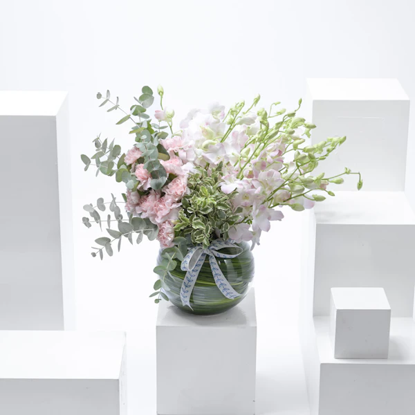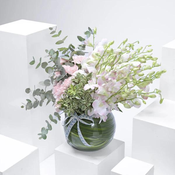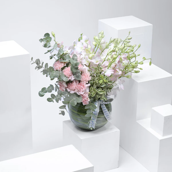 تنسيق مزهرية مكونة من زهور الكارنيشن زهرية اللون و بيبي اوركيد زهري اللون