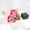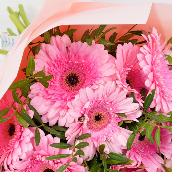 - باقة أزهار ناعمة مُنسقة بمجموعة من أزهار الجربارة الوردية مع أوراق البستاسيا الخضراء.