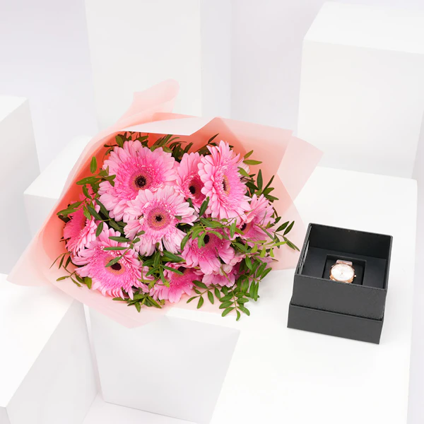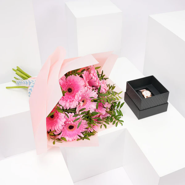 نُسقت هذه الهدية الأنيقة بالتعاون مع الشايع للساعات وفريقنا المبدع بتنسيق الأزهار لتكون الهدية المثالية لجميع مناسباتكم السعيدة.