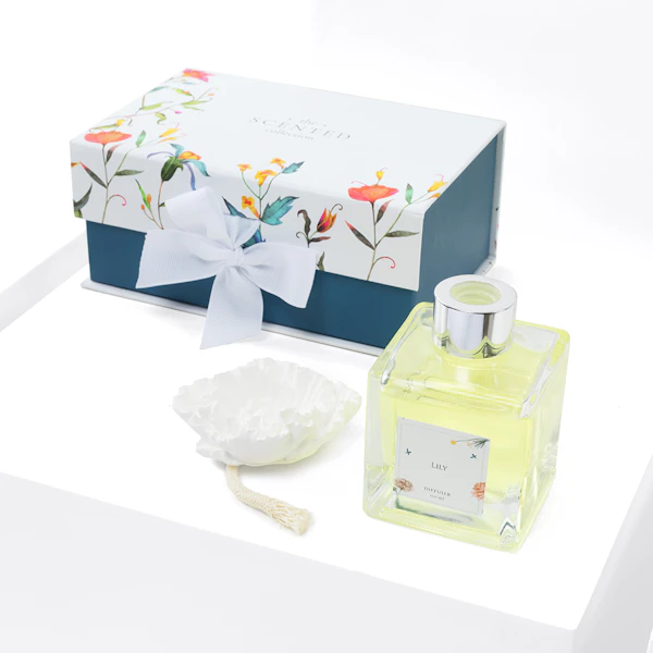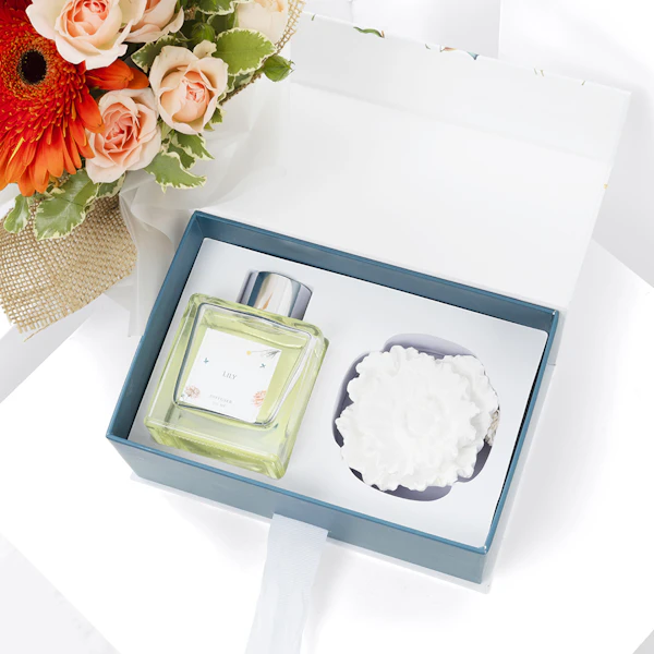 قدم لأحبائك هدية مثالية المتمثلة في موزع الروائح العطرية ليلي مع باقة زهور مذهلة في غلاف بني وأبيض.