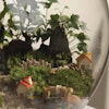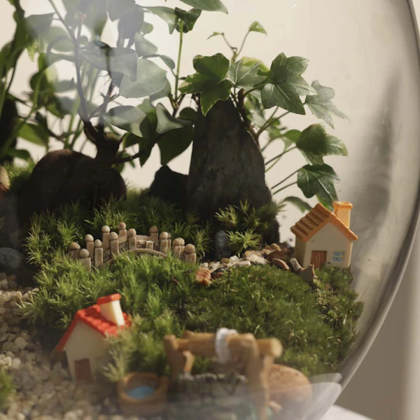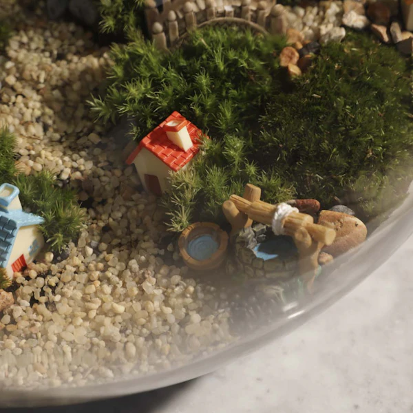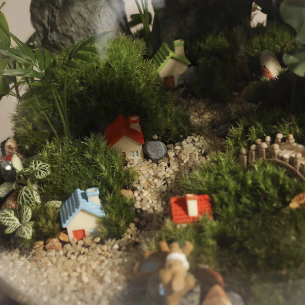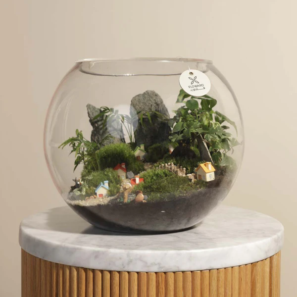 أضف لمسة من السحر الاستوائي إلى منزلك مع قرية التيراريوم الصغيرة الفريدة. تتضمن هذه التحفة الطبيعية مجموعة من النباتات الرائعة مثل الهيدرانجيا الخضراء، شجرة البونساي القزمي، ونخل الاريكة القزمي، بجانب طحالب خضراء تضفي حيوية على المنظر. كما تحتوي على منازل صغار ملونة وجسر عبور يضفيان لمسة سحرية، إضافة إلى بركة ماء ومجسم حمار لحمل الماء من البئر، مما يخلق مشهدًا رائعًا في مزهرية زجاجية دائرية. استمتع بجمال هذه الحديقة الصغيرة واجعلها جزءًا من ديكورك المنزلي اليوم حوّل مساحتك بهذا التيراريوم الاستوائي الساحر—مثالي لإضافة لمسة من الطبيعة والسحر إلى أي غرفة.