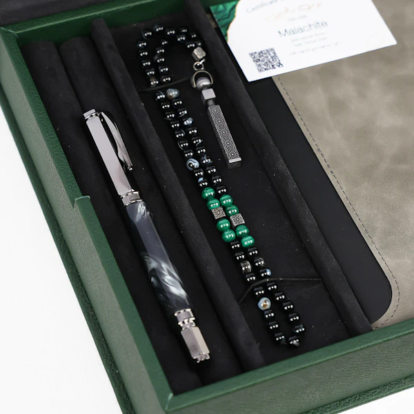 اكتشف قمة الأناقة في مجموعتنا المميزة من بالقلم التي تضم قلم راء من التيتانيوم ، ومسبحة من مالاكيت والأونيكس الأسود، ومفكرة، مقترنة بجمال طبيعي يتمثل في 5 زهور دوارالشمس و2 كالا بيضاء في مزهرية خضراء رائعة. تجمع هذه المجموعة الفريدة بين فن الكتابة الرفيع وروحانية الخرز الديني. ينزلق قلم بيلقلم من التيتانيوم راء بسهولة على الورق، في حين تضيف مسبحة المالاكيت والأونيكس الأسود لمسة من السكينة للأوقات التي تخصصها للتأمل. احتفظ بأفكارك في المفكرة المرافقة بينما تستمتع بتوهج زهور دوارالشمس الطازجة و الليليوم الكالا الأنيقة. ارتق بتجربة الهدايا الخاصة بك بهذا الدمج المنسجم بين الأناقة والروحانية.