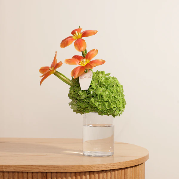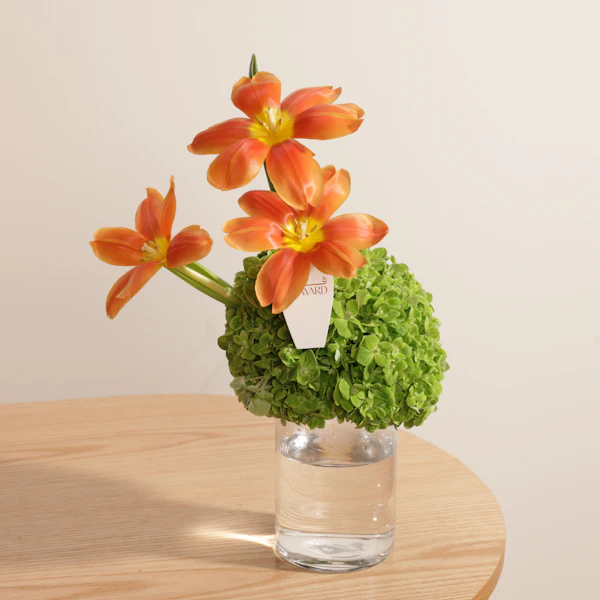 تألق بهديتك مع هذا التنسيق راقي من زهور الهيدرانجيا الخضراء، التي تنبثق منها زهور التوليب البرتقالي المشرقة، لتبدو وكأنها بجع شامخ يقف في بحيرة خضراء ساحرة. هذا التناغم الفريد بين ألوان الزهور وأشكالها يجعل هذه الفازة قطعة فنية تضفي لمسة من السحر والفخامة على أي مكان توضع فيه. مثالية لجميع المناسبات، من الهدايا الراقية إلى تزيين منزلك أو مكتبك بأناقة لا تضاهى. اطلب هذه الهدية الآت، واسعد أحباءك وأضف لمسة من الرقي والجمال على حياتهم.