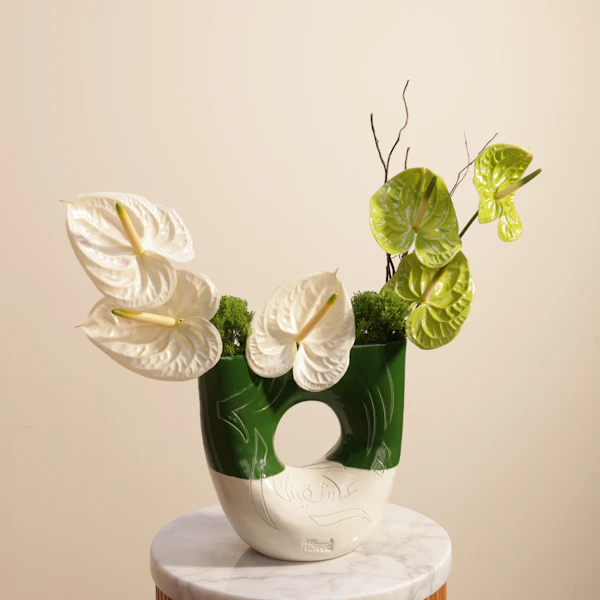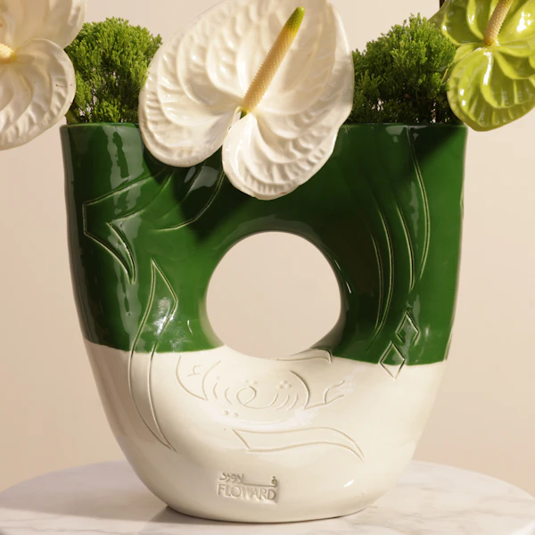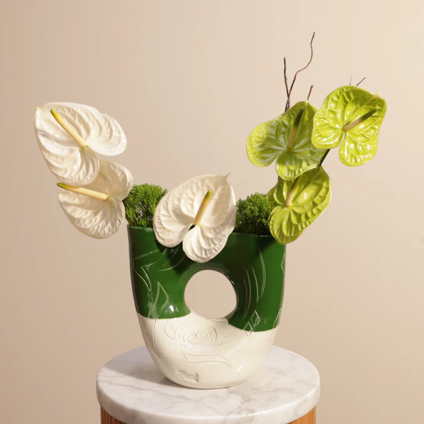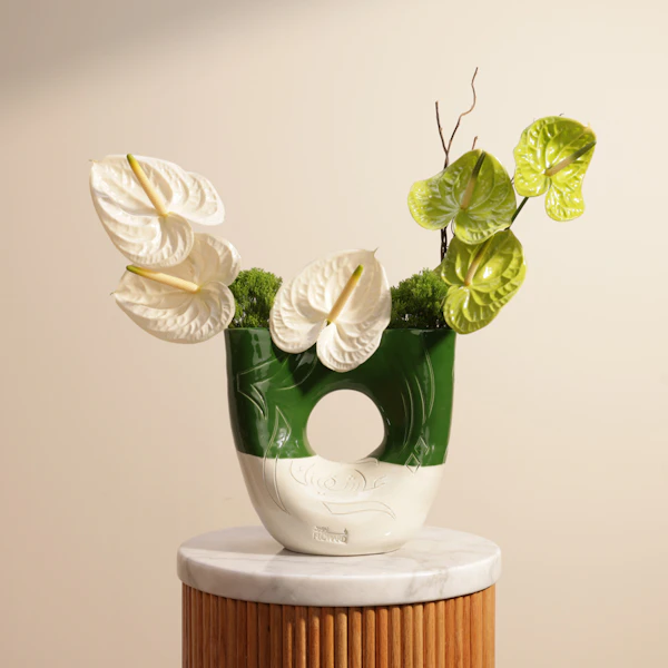 تنسيق الزهور الرائع من كيراموس هو الخيار المثالي لتقديم هدية تعبّر عن التراث السعودي بلمسة عصرية. يتألف هذا التنسيق المميز من زهور أنثوريوم الأخضر وأنثوريوم الأبيض، مقدمة في مزهرية سيراميك مصنوعة يدوياً بتصميم أنيق يجمع بين اللونين الأخضر والأبيض، مما يعكس جمالية التراث السعودي. يجسد هذا التنسيق تناغماً مثالياً بين الطبيعة والفن، ويضيف لمسة من الأناقة إلى أي مناسبة. اطلب أحلى هدية الآن وامنح أحبائك تجربة مميزة ومليئة بالدفء والجمال، حيث تجتمع الألوان والتصاميم لتخلق لحظات لا تُنسى. اجعل كل مناسبة أكثر تميزاً مع هذه الهدية الفريدة، واستمتع بتقديم لمسة من الفخامة والذوق الرفيع.