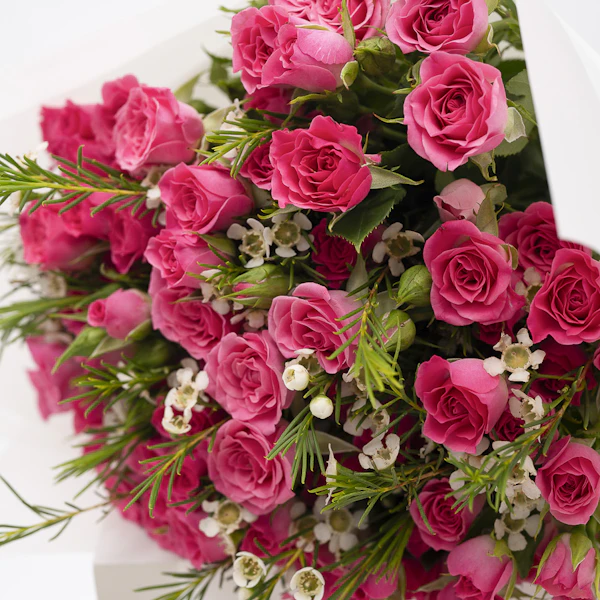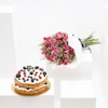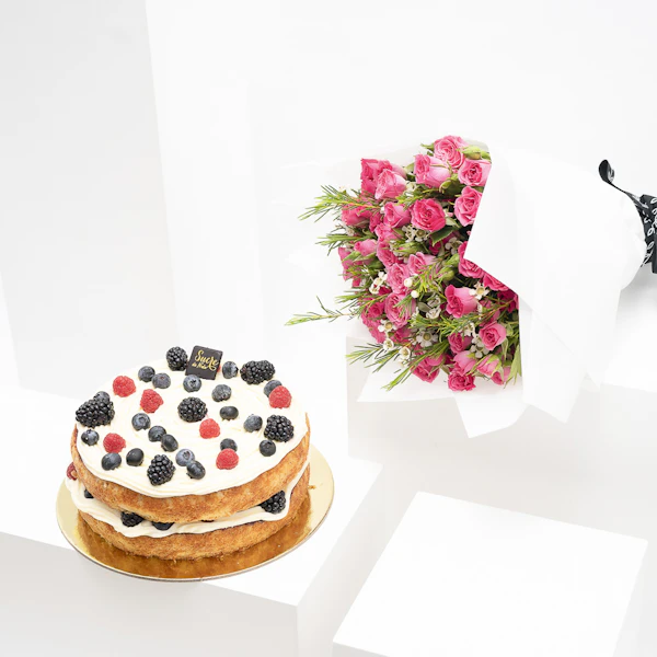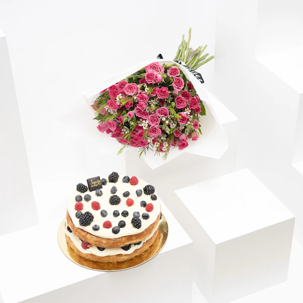 الأسعار شاملة الضرائبكيك فانيليا وشوكولاتة بيضاء من سكر الندى | باقة زهور فوشيا