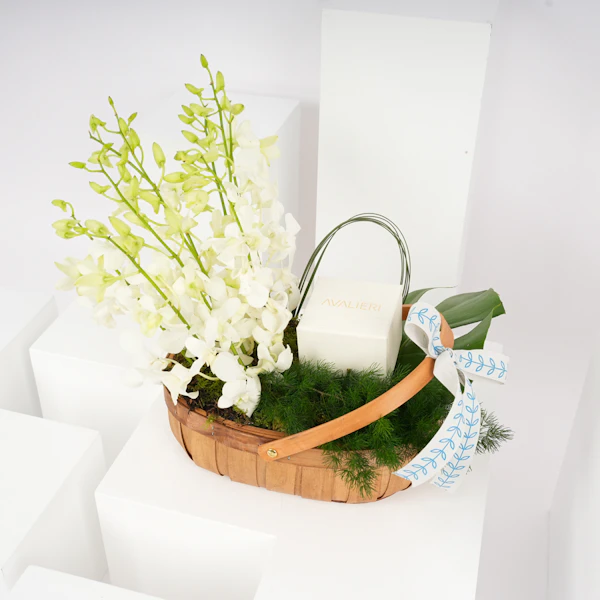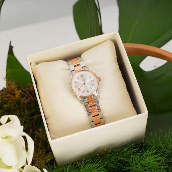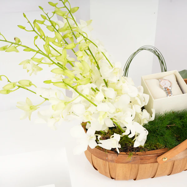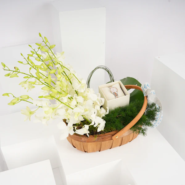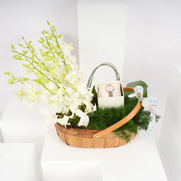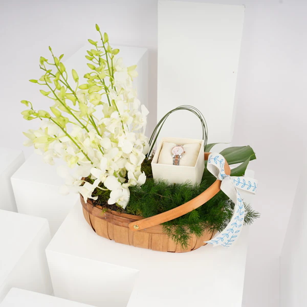 نُسقت هذه الباقة الناعمة مع ساعة نسائية فاخرة لتصنع هدية شاملة تجمع ما بين أناقة الوقت وجمال الطبيعة. هذه الهدية مثالية للمناسبات الخاصة مثل الأعياد أو الاحتفالات، معبرة عن مشاعر الحب والتقدير، وتعكس روحًا دائمة الجمال والأنوثة.