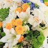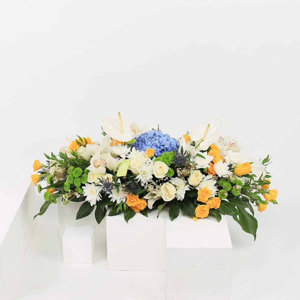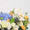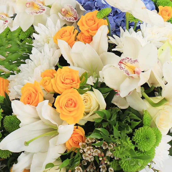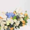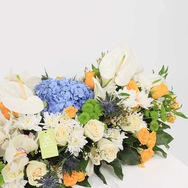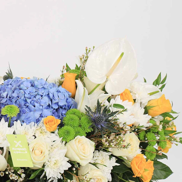 احتضن رونق الأناقة والرقي مع ترتيباتنا الزهرية الرائعة، رائعة من أروع أزهار الطبيعة. اسعد حواسك ورفع مستوى أي مناسبة مع الخليط المتناغم من الهايدرانجيا الزرقاء، والورود الجورى البيضاء الرقيقة، وورود البيبي جورى  الصفراء المبهجة، والسيمبيديوم الأبيض الأنيق، واللليليوم الأبيض الساحر، والأقحوان الأخضر النقي. كل زهرة تهمس بقصص الجمال والأناقة، تلخص نقاء العواطف. سواء كانت لفتة حب أو تقدير أو احتفال، فإن ترتيباتنا المدروسة بعناية تعد بأن تأسر القلوب وتترك انطباعًا دائمًا. أحضر لمسة من السحر الخالد إلى عالمك مع هذا التجميع المذهل.