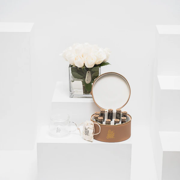 امتع من تحب بعالم الشاي الفاخر مع فيل جود تي! صندوق الجلد الأنيق يكشف عن 10 نكهات شاي شهية ومتنوعة، من الفانيليا الناعمة إلى نكهة الكيوي المنعشة والنعناع المنعشة. يتضمن الصندوق كوب زجاجي مصمم بمصفاة داخلية لتجربة شاي مميزة لعاشقي الشاي، ومزهرية زجاجية تضيف لمسة أنيقة مع 20 وردة جوري بيضاء. اجعل أحبائك يشعرون بالسعادة مع هذا الهدية الرائعة!