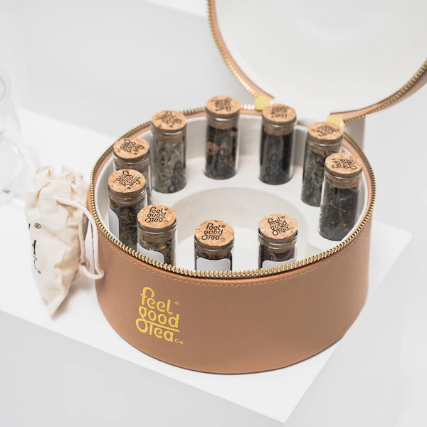 • صندوق الشاي الجلد باللون البيج من فيل قود، يحتوي على 10 نكهات شاي بالإضافة الى 15 كيس شاي قابل للتحلل وكوب مونرو الزجاجي مع مصفاة شاي داخلية.
