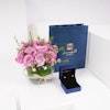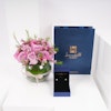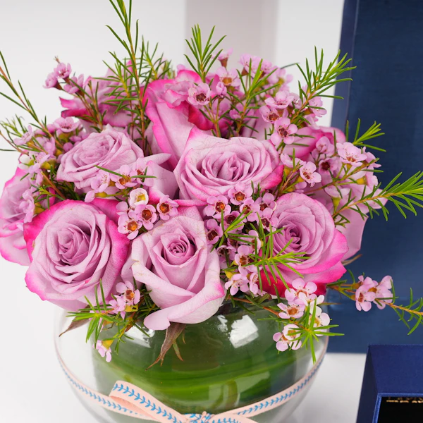 يعتبر حلق الماس من لابيز، المصنوع من الذهب الأبيض اللامع عيار 18 ، تحفة من الأناقة والفخامة. ينضح هذا الملحق بالرقي الخالد. مع الجوري البنفسجي الغنية، يشكل مزيجًا مذهلاً يعرض الفخامة والجمال الطبيعي. تضيف زهرة الشمع البنفسجي عمقًا إلى الترتيب من خلال أزهارها العطرة المعقدة. يتم عرض هذه الزهور الـ 15 الرائعة بشكل فني في مزهرية دائرية زجاج رقيق، مما يخلق مزيجًا آسرًا ومتناغمًا من المجوهرات والأزهار مما يجعلها هدية رائعة لا تُنسى.