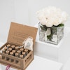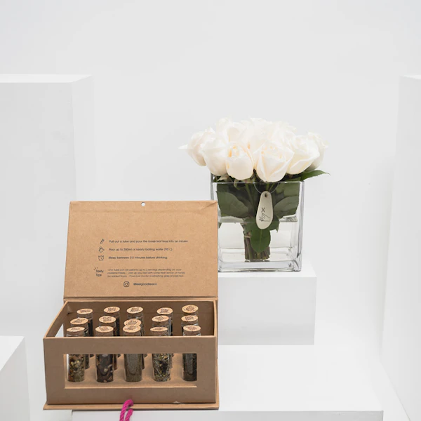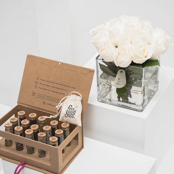 استمتعوا بإضفاء البهجة اللطيفة على قلوب من تحبون مع هدية صندوق الاكتشاف الاوريجنال من فيل جود تي. يحتوي هذا الصندوق على تشكيلة رائعة من نكهات الشاي المنتقاة بكل عناية  والتي تم توزيعها على 15 أنبوب. تتضمن النكهات تنوعًا مميزاً مثل كريمة الفراولة السيلاينية، إيرل غراي مع لمسة مميزة، نكهة الكركم اللذيذة، ليمون الزنجبيل المنعش، نكهة بلايند فولد مي، بينا كولادا الاستوائية، الشاي الأبيض النقي، نكهة صباح الخير، البحر الأزرق الهادئ، شفاه الكرز الحلوة، خليط البطارية الإضافية، انتعاش المينتي ريفريش، شاي التنحيف الصحي، ابيزا موكتيل، ونكهة أزهار الكرز العطرية. ولإضفاء المزيد من الأناقة على هذه الهدية الراقية، نُسقت مع مزهرية زجاجية تحتوي على 20 وردة من الجوري الأبيض.