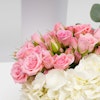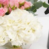 • فازة أزهار زجاجية مستديرة الشكل مُنسقة بورد الجوري الوردي الصغير، زهرة الهيدرينجا البيضاء مع اليوكالبتس.