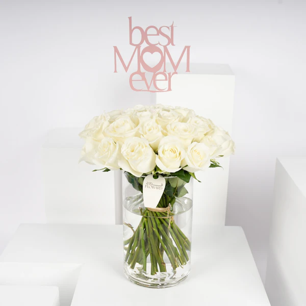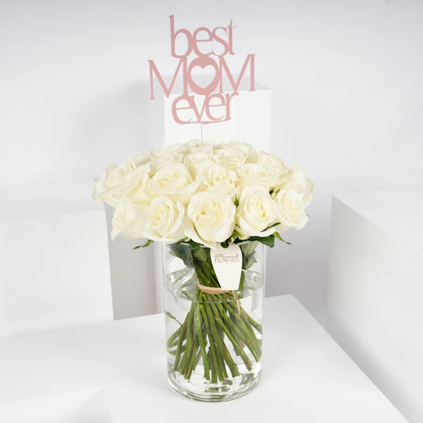 احتفل بالأم المبهرة في حياتك بتقديم هدية فاخرة تتضمن ورود جورى بيضاء رقيقة مرتبة بأناقة في مزهرية زجاجية شفافة. مزينة بعود تزيين عليه عبارة "أفضل أم على الإطلاق" بالإنجليزية، لترمز إلى الحب والامتنان. الورود البيضاء تجسد الحب اللامتناهي والإعجاب الذي تحمله لأم الرائعة في حياتك. دع هذه اللفتة العميقة تعبر لها عن عمق الامتنان والحب الذي تحمله لها، مُذكرة إياها بأهميتها التي لا تقدر بثمن في حياتك!