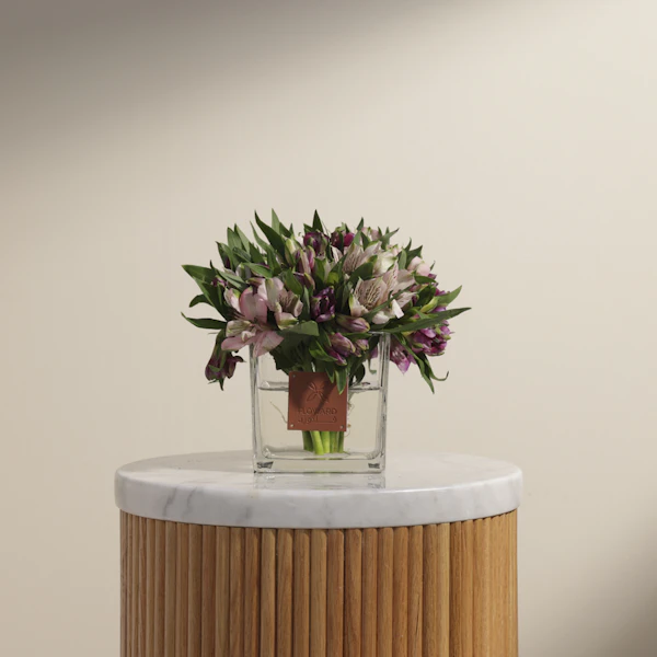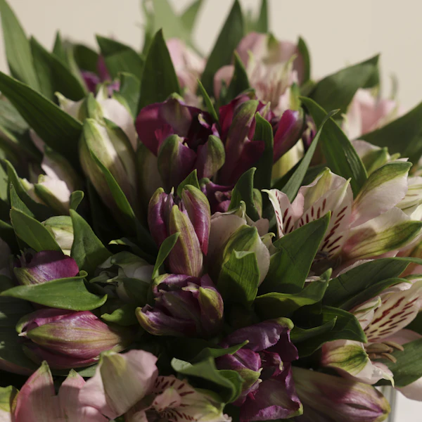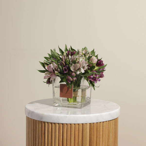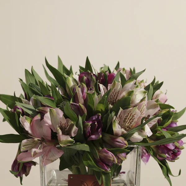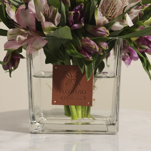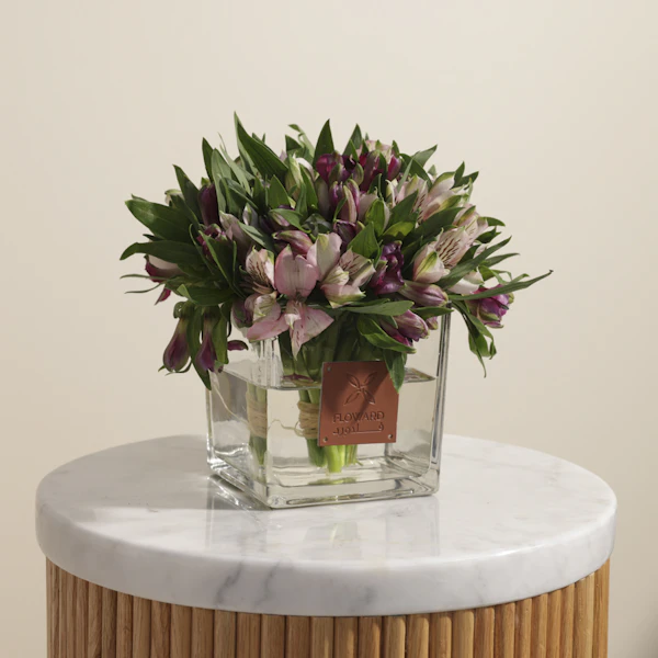 نُسقت هذه الباقة المميزة لتشارككم لحظاتكم المبهجة ولتكون الهدية المثالية لإيصال مشاعركم الدافئة وامنياتكم السعيدة لمن تحبون، حيث تحتوي على مجموعة من أزهار الاستروميريا التي تحمل بدلالاتها على معاني الصداقة، الحب والوفاء. زُينت المزهرية الزجاجية بمجموعة من أزهار الاستروميريا الوردية والبنفسجية معاً.