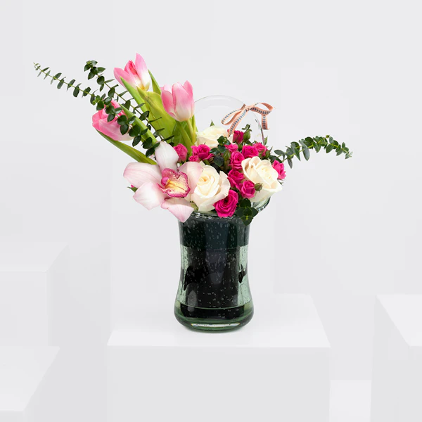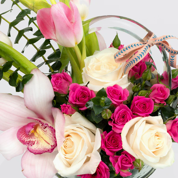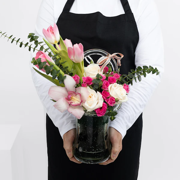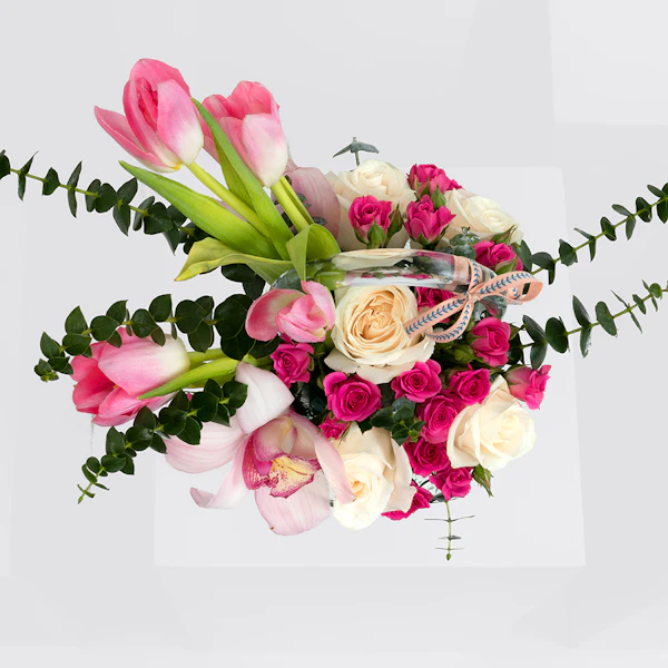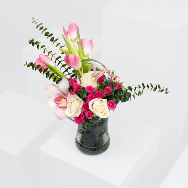 يحتوي هذا الترتيب على توليب الوردي ، سيمبيديوم وردي ، ورد أبيض ، بيبي روز فوشيا ، أوكالبتوس