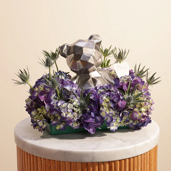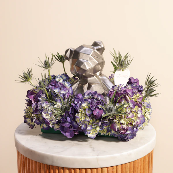 اجعل لحظاتك أكثر تميزًا مع باقة ارينجيوم الأزرق والهيدرانجيا البنفسجي في مزهرية زجاجية أنيقة. تحتوي هذه الهدية الفريدة على 7 زهور ساحرة، مع لمسة إضافية من الفخامة بوجود دب فضي. تضيف هذه الباقة لمسة من الألوان الرائعة والجمال الهادئ إلى أي مساحة، مما يجعلها الاختيار المثالي لتجعل كل مناسبة أو ديكور أكثر تميزًا وأناقة.