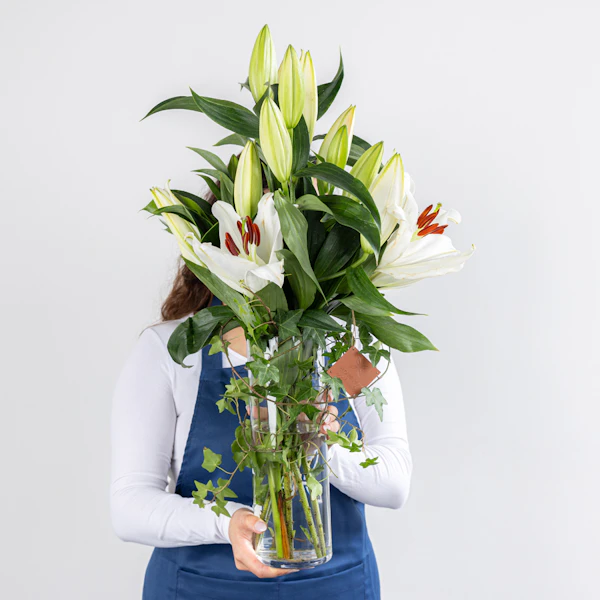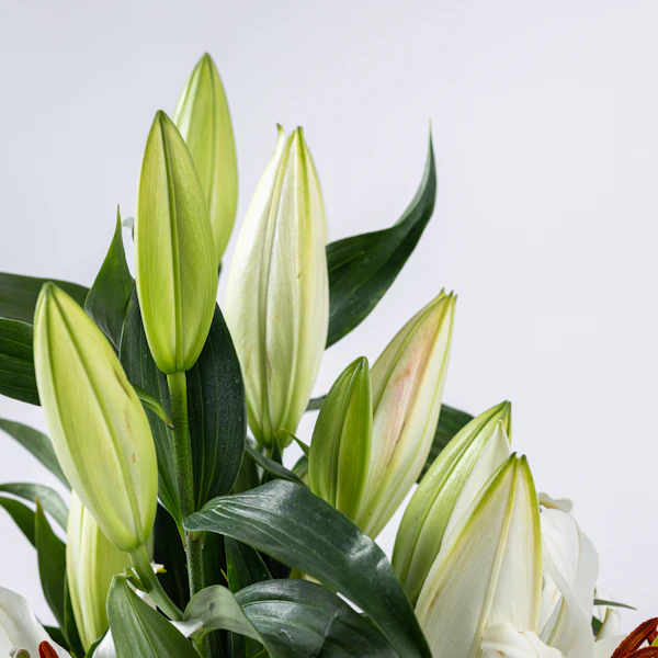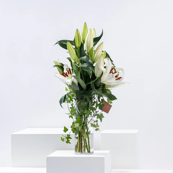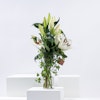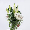 زهور الليلي البيضاء الجميلة، مع بتلاتها النقية، تقف شامخة في عرض من الأناقة والنعمة. تضيف إضافة ورقة مونستيرا واحدة، جريئة وخضراء، لمسة عصرية ومهيبة. زيّن أي مساحة بهذه الباقة الخالدة، التي تجسّد النقاء والعظمة البسيطة.