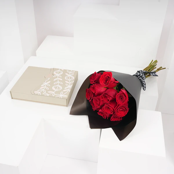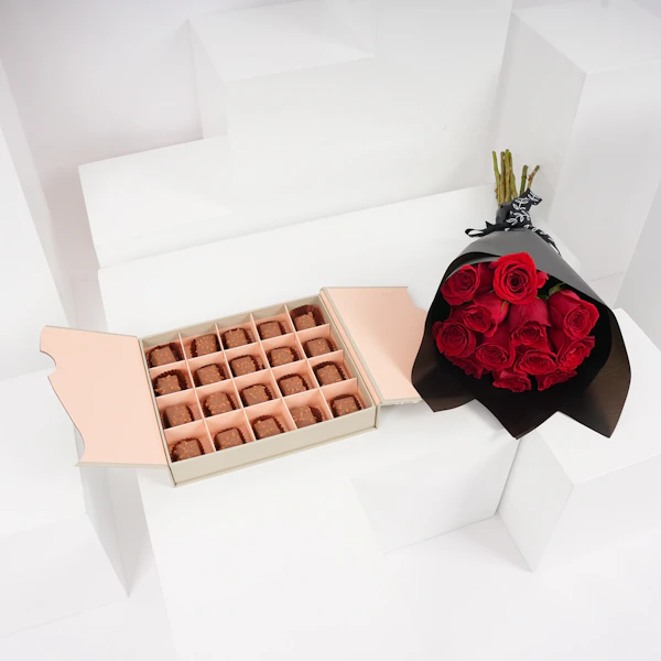 فاجئ من تحب بالورود والشوكولاتة التي تعد لغة الحب الخالدة! صندوق شوكولاتة فلاورد هو كنز لذيذ، يحتوي على حبات الشوكولاتة الكرنشي الفاخرة. تكمل هذه اللذة الحلوة بشكل مثالي باقة رائعة من الورود الجوري الحمراء، مُنسقة بعناية لتجسد جوهر الرومانسية. اجعل كل لحظة مشتركة احتفالًا بالحلاوة والحب. اسعد من تحب في يوم الحب، بفضل شوكولاتة فلاورد الساحرة وجاذبية باقة الورود الحمراء الخالدة.