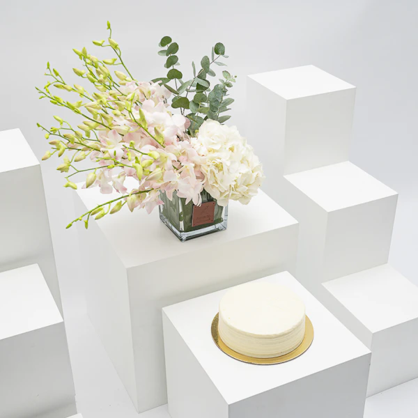 أحتفلوا بفن الإهداء مع مجموعتنا الساحرة التي تجمع بين الطعم والجمال. كعكة الفانيليا من منش بيكرى لدينا، مصممة لستة أشخاص، هي لذيذة ستجعل أي تجمع لا يُنسى. مقرونة بأناقة الهيدرانجيا البيضاء الخالدة وسحر الأوركيدا الوردية الرقيقة، والتي تعرض جميعها في وعاء زجاجي مربع أنيق، هذه الهدية هي مزيج متناغم بين النكهات والجمال. سواء كان ذلك كشكر صادق أو احتفالًا بالحب، فإن هذه الهدية الرائعة من المؤكد أن تعبّر عن مشاعرك بأناقة وطعم رائع.