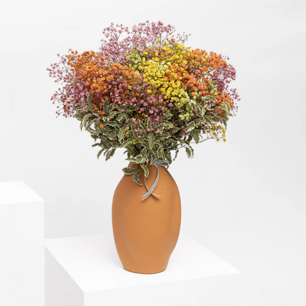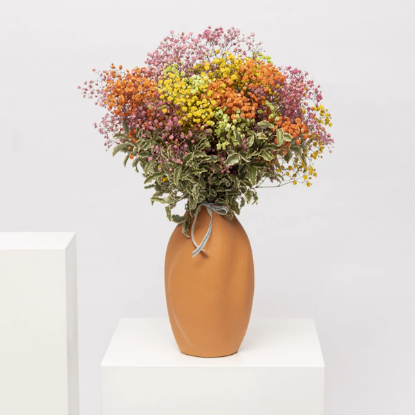 تم ترتيب ألوان جيبسوفيلا النابضة بالحياة و بيتوسبوروم الأخضر الجميل في مزهرية برتقالية رائعة. مزهرية الوان البراقة هي الهدية المثالية للتعبير عن الشكر ، عيد ميلاد سعيد ، أو أي شيء آخر في هذا الشأن ، لجعل ابتسامة من تحب.