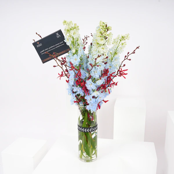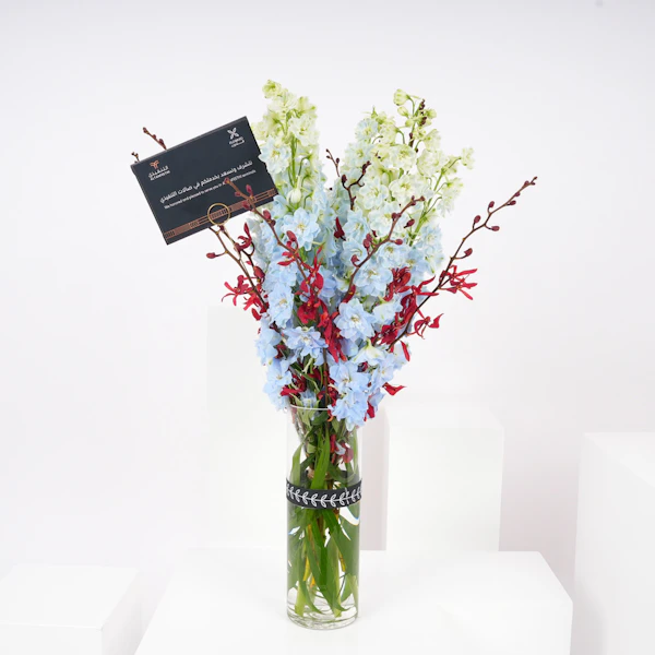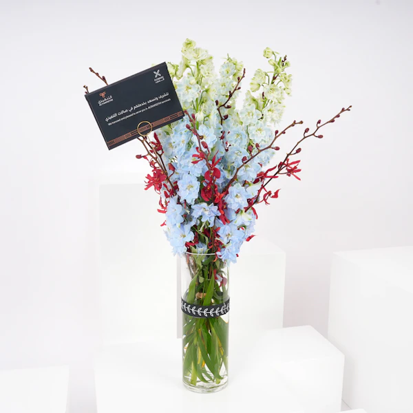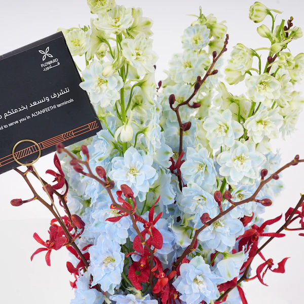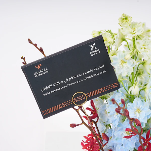 ارتقِ بتجربة سفر من تحب باستخدام مجموعتنا الحصرية. داخل مزهرية ساحرة تضم أزهار أوركيد بيبي حمراء وزهور ديلفينيوم زرقاء فاتنة، ستجد بطاقة التنفيذي من شركة المكاتب التنفيذية" التي تدير كافة الصالات والمكاتب التنفيذية في جميع مطارات المملكة. البطاقة تمنح حاملها عدة مزايا منها مدخل خاص للصالة التنفيذية بعيداً عن زحام المطار، مناطق تسوق خاصة تشمل مجموعة مختلفة من العلامات التجارية الفاخرة، ضيافة مميزة تشمل مجموعة متنوعة من المأكولات العالمية، خدمة الاستقبال والترحيب اثناء الذهاب والعودة تشمل اصطحاب صاحب البطاقة من الصالة حتى بوابة الطائرة بسيارة فاخرة. تتضمن خدمات مميزة مثل إتاحة اتصال سريع بالإنترنت ومناطق تسوق خاصة ومركز أعمال يتضمن غرفة اجتماعات متاحة على مدار 24 ساعة. قدم هدية تجربة سفر استثنائية مع مجموعتنا الرائعة.