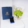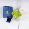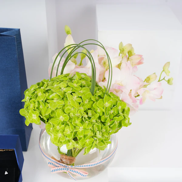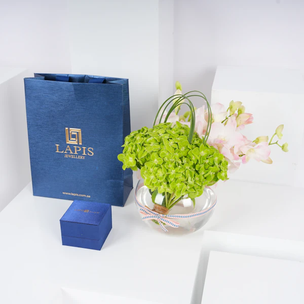 ر.س3535زيّني نفسك بأناقة لا تعتبر بالزمن مع أقراط لابيز الماسية 0.3 قيراط . مصنوعة من الذهب الأبيض الراقي عيار 18 قيراط، تعتبر هذه الأقراط سيمفونية من الأناقة. الماس يرقص برفق، يلتقط جوهر اللمعان. مقرونة بسحر الهايدرانجيا الخضراء وجاذبية بيبي اوركيد الوردي ، يتم عرض هذا التجمع بشكل أنيق في مزهريه زجاجيه دائريه. ارتقي بأسلوبك مع هذه الأقراط التي تجمع بين بريق الماس وجمال الزهور المتفتحة.