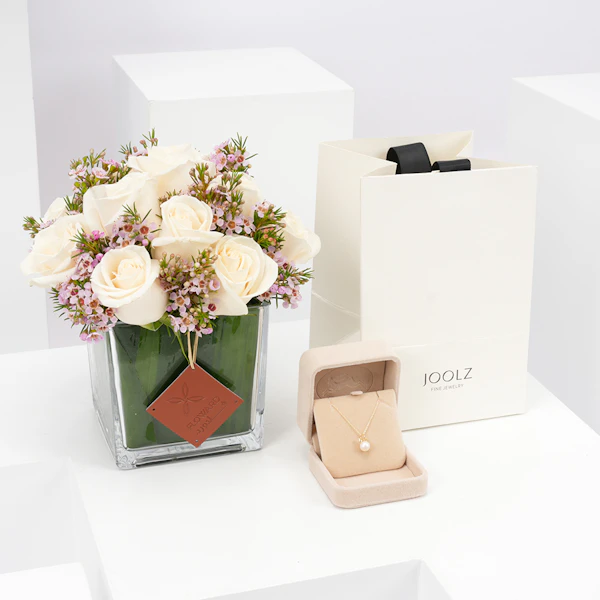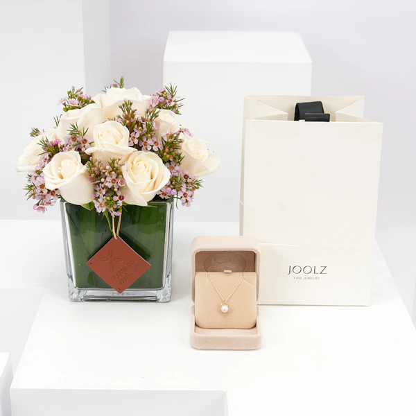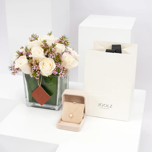 نُسقت هذه الهدية الأنيقة بالتعاون مع جولز للمجوهرات وفريقنا المبدع بتنسيق الأزهار لتكون الهدية المثالية لاحتفالاتكم بالمواليد الجدد.