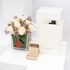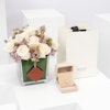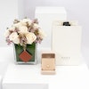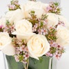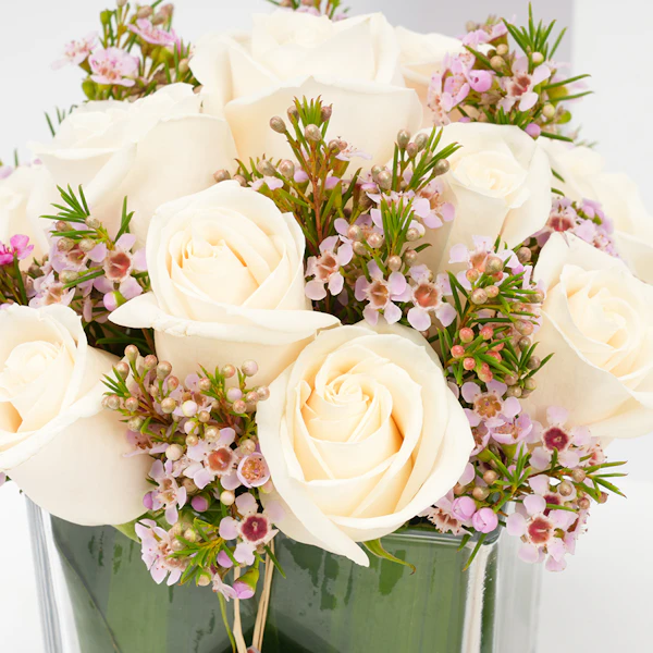• مزهرية زجاجية مربعة الشكل مُنسقة بورد الجوري الأبيض مع أزهار الواكس البنفسجية.