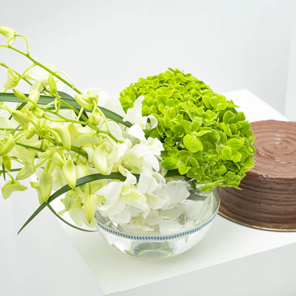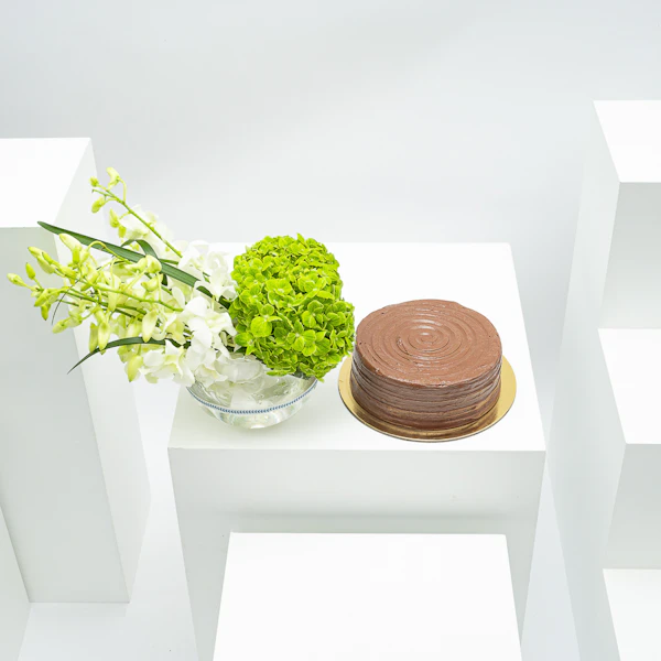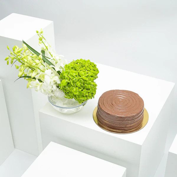 SKU FC70773امنح حواسك البهجة مع مجموعة الهدية الساحرة لدينا، والتي تجمع بين النكهة والجمال بكمال. استمتع بشهية كd; الشوكولاتة من منش بيكرى ، وهي لذيذة لستة أشخاص محظوظين. بجانب هذه التحفة ، اكتشف ترتيبًا رائعًا يضم 15 زهرة بيبي أوركيد وردية رقيقة وزهرة هيدرانجيا بيضاء واحدة، والتي تُعرض بأناقة في مزهرية زجاجية مربعة. هذه الهدية تجمع بين غنى الشوكولاتة وسحر الطبيعة بشكل مثالي، مما يجعلها خيارًا مثاليًا لجميع المناسبات. افاجئ أحبائك بنكهة الرفاهية وجمال النباتات، كل ذلك مجتمعًا في هدية استثنائية واحدة.