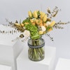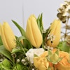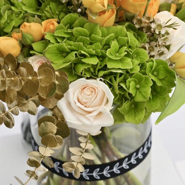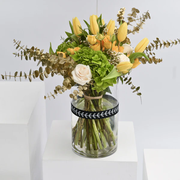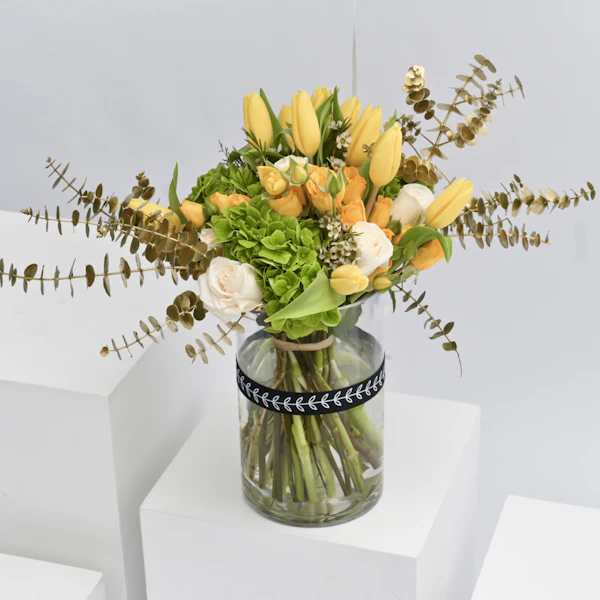 - فازة أزهار زجاجية اسطوانية الشكل مُنسقة بأزهار التوليب الصفراء، ورد الجوري الصغير الأصفر، ورد الجوري الأبيض، أزهار الهيدرينجا الخضراء، اليوكالبتس الذهبي، أزهار الواكس البيضاء بالإضافة الى بالون التخرج.