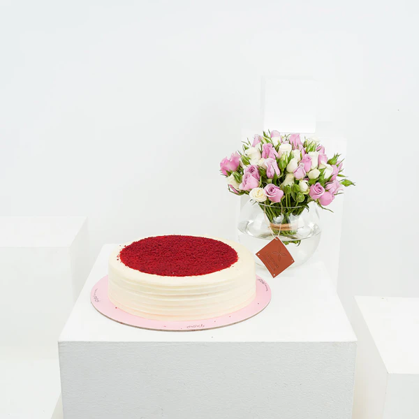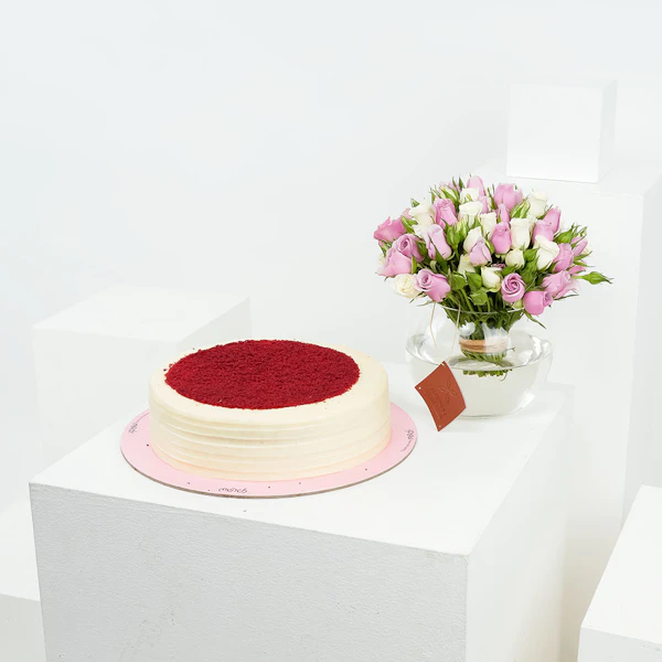 تنسيقه تحتوي على روز و كيك منش رد فلفت تكفي 6 اشخاص