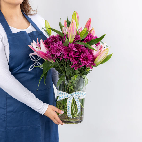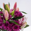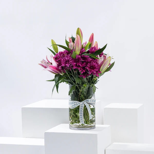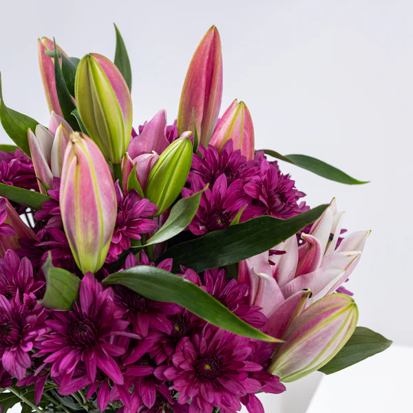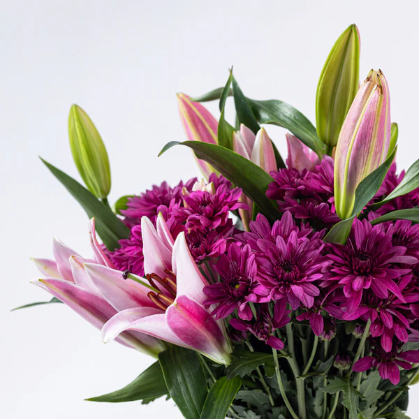 ترتيب مذهل يمزج بسلاسة الجاذبية الملكية للكزنتمم الأرجواني مع السحر الرقيق للليلي الوردية. يتم ترتيب كل زهرة بدقة، مما يخلق رقصة متناغمة من الألوان. إضافة الأوراق الخضراء المورقة تعزز الجمال الطبيعي للباقة، مما يوفر لمسة من النضارة والحيوية. ارتقي بأي مساحة بالحضور الساحر لهذه الأزهار، وهي شهادة على الجمال الموجود في الاتحاد المثالي بين اللون الأرجواني والوردي والأخضر.
