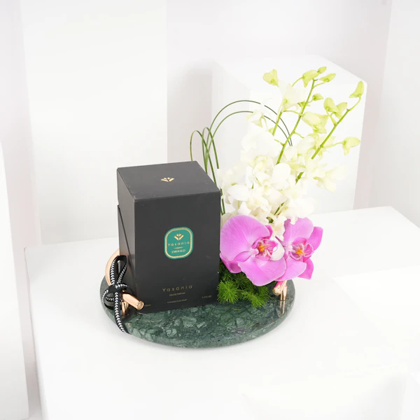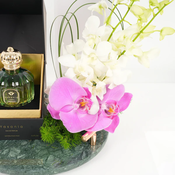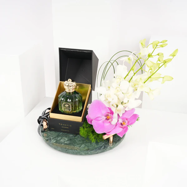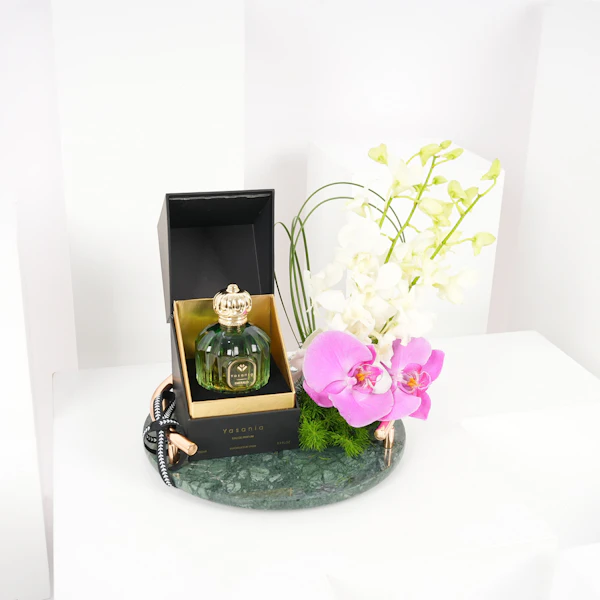 تقدم لكمعطر ايميرالد من ياسانيا ، عطر يتجاوز حدود الجنسين، يحتفي بجوهر الفرادة. مقترن بترتيب رائع من بيبي أوركيد أبيض و أوركيد بنفسجى في صينية دائرية من الرخام، إنه رحلة حسية ولذيذة بصرياً. أطلقوا عنانًا لروائح Yasania Emerald الحيوية، متناغمة مع الزهور الرقيقة، لتخلق تجربة تأسر الحواس. قوموا بترقية مساحتكم وأسلوبكم بهذا العطر وهذا الفن الزهري – سيمفونية من الروائح والجمال.