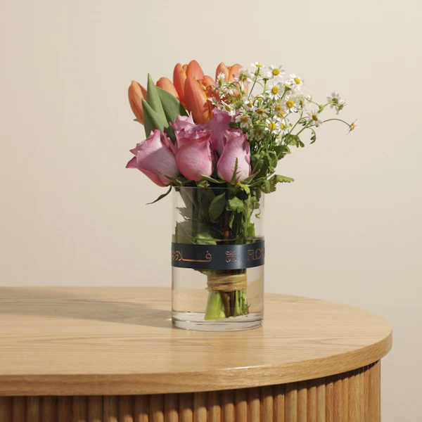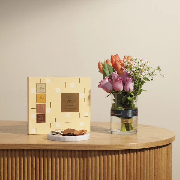 احتفل بلحظات السعادة مع صندوق شوكولاتة من جوديفا يحتوي على 60 قطعة من أصناف الشوكولاتة النقية، بما في ذلك الأبيض، الحليب، الداكن 50%، والداكن 72%، والتي تصنع في بلجيكا بعناية فائقة. هذه الهدية الفاخرة تضمن لك تجربة شوكولاتة فاخرة ولذيذة، تحتفظ بالنكهة الأصيلة والجودة العالية. ومع الصندوق الرائع، يأتي جوري بنفسجي وتوليب برتقالي في مزهرية زجاجية أسطوانية، مما يضفي لمسة من الجمال والرومانسية على هذه الهدية المميزة، مما يجعلها مثالية لأي مناسبة خاصة.