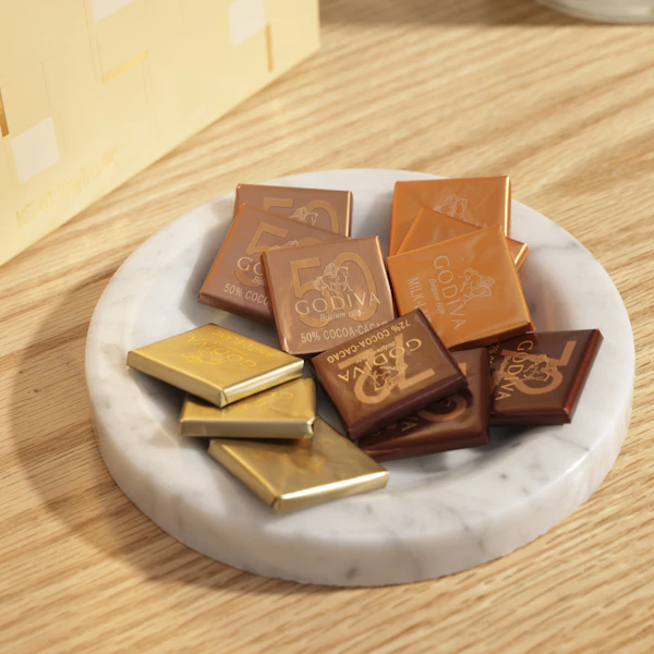 - صندوق شوكولاتة من جوديفا , 60 قطعة من أصناف الشوكولاتة النقية: الأبيض، الحليب، الداكن 50%، والداكن المر 72%، والتي تصنع في بلجيكا, 60 قطعة