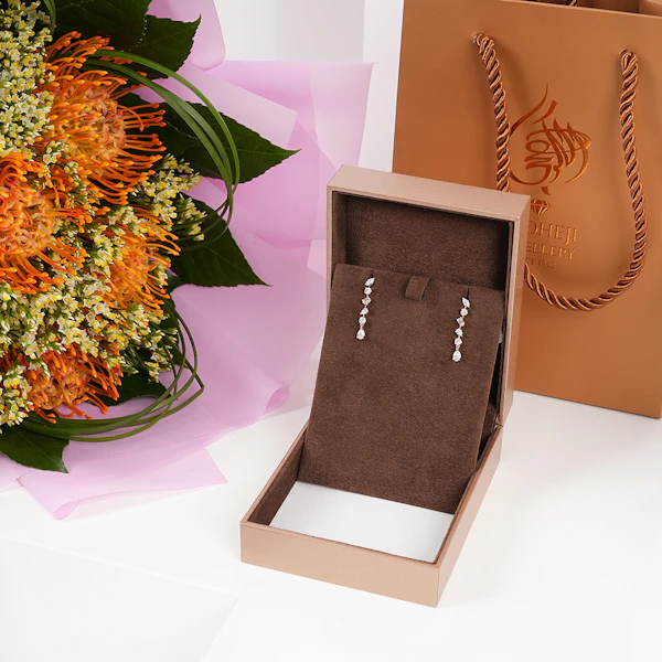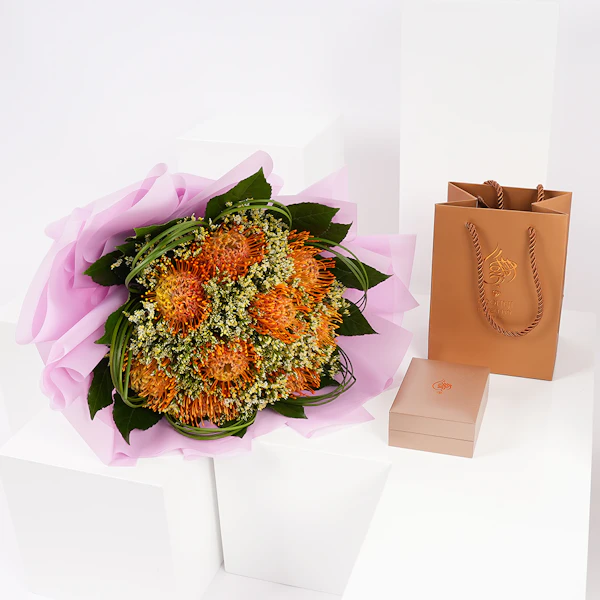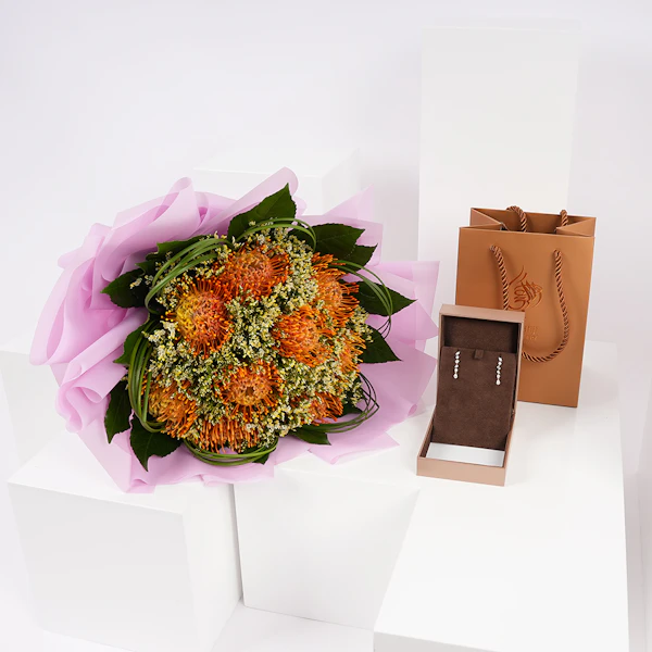 نُسقت هذه الهدية الأنيقة بالتعاون مع مجوهرات الكوهجي وفريقنا المبدع بتنسيق الأزهار لتكون الهدية المثالية لمناسباتكم السعيدة.